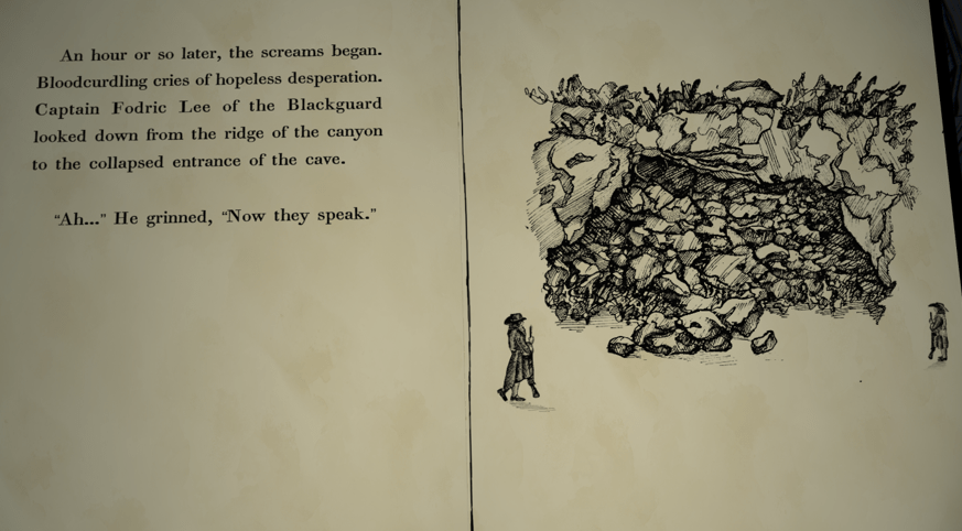 An hour or so later, the screams began. Bloodcurdling cries of hopeless desperation. Captain Fodric Lee of the Blackguard looked down from the ridge of the canyon to the collapsed entrance of the cave.