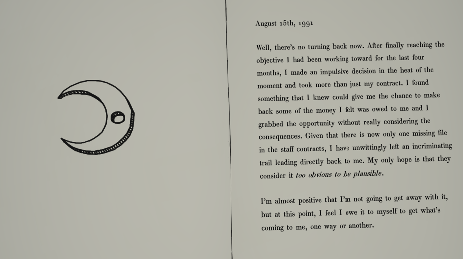 Well, there’s no turning back now. After finally reaching the objective I had been working toward for the last four months, I made an impulsive decision in the heat of the moment and took more than just my contract. I found something that I knew could give me the chance to make back some of the money I felt was owed to me and I grabbed the opportunity without really considering the consequences. Given that there is now only one missing file in the staff contracts, I have unwittingly left an incriminating trail leading directly back to me. My only hope is that they consider it too obvious to be plausible.