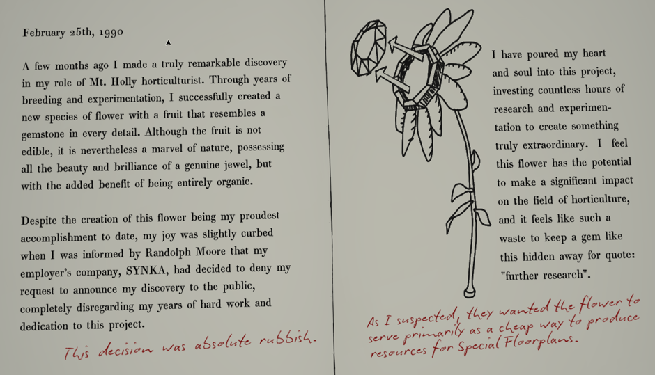 Despite the creation of this flower being my proudest accomplishment to date, my joy was slightly curbed when I was informed by Randolph Moore that my employer’s company, SYNKA, had decided to deny my request to announce my discovery to the public, completely disregarding my years of hard work and dedication to this project.