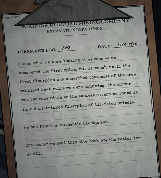 I knew what we were looking at as soon as we uncovered the first spire, but it wasn’t until the first floorplan was unearthed that most of the crew realized what ruins we were exhuming. The border was the same pitch as the sunless cavern we found it in, a dark-trimmed floorplan of ill-fated Orindia.