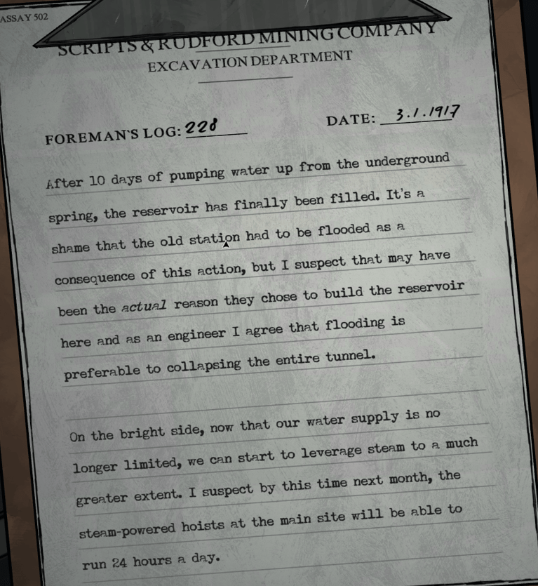 On the bright side, now that our water supply is no longer limited, we can start to leverage steam to a much greater extent. I suspect by this time next month, the steam-powered hoists at the main site will be able to run 24 hours a day.