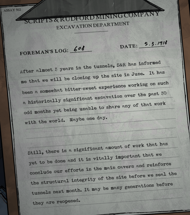 Ainda há uma quantidade significativa de trabalho a ser feita, e é vitalmente importante que concluamos nossos esforços na caverna principal e reforcemos a integridade estrutural do local antes de selarmos os túneis no próximo mês. Pode levar muitas gerações até que eles sejam reabertos.