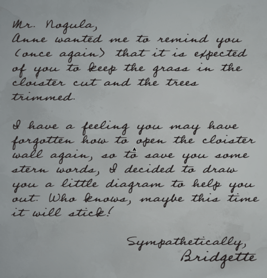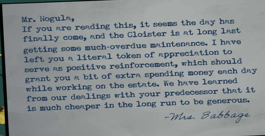 Se você está lendo isto, parece que finalmente chegou o dia, e o Claustro está, enfim, recebendo a tão necessária manutenção. Deixei para você um pequeno símbolo literal de apreço para servir como reforço positivo, o que deve lhe garantir um pouco de dinheiro extra por dia enquanto trabalha na propriedade. Aprendemos com nossa experiência com seu antecessor que, a longo prazo, é muito mais barato ser generoso.