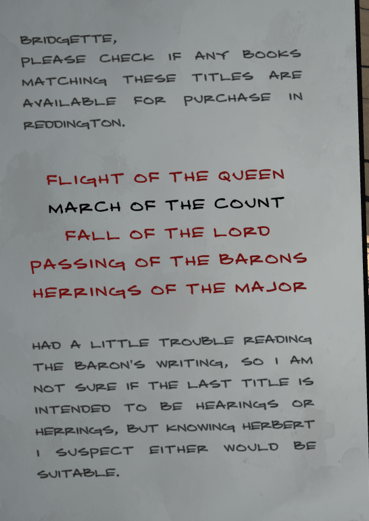 Tive um pouco de dificuldade para ler a escrita do Barão, então não tenho certeza se o último título é Audiências ou Arenques, mas conhecendo o Herbert, suspeito que qualquer um dos dois serviria.