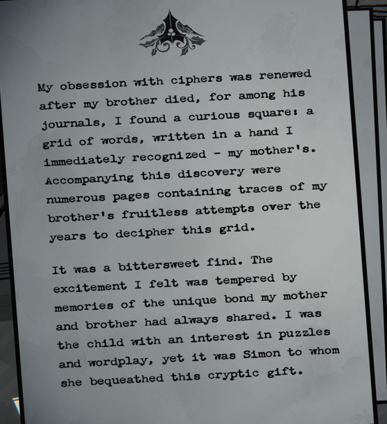 Minha obsessão por cifras foi reacendida após a morte do meu irmão, pois entre seus diários encontrei um quadrado curioso: uma grade de palavras, escrita com uma caligrafia que reconheci de imediato — a da minha mãe.