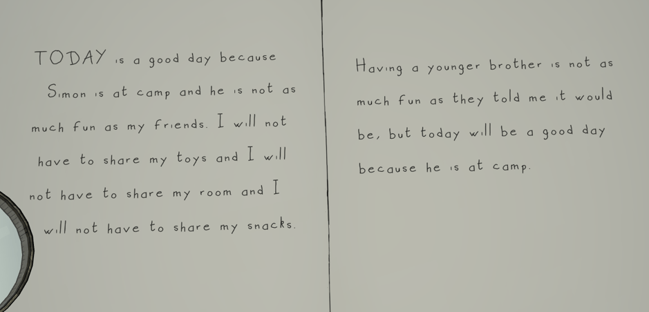 TODAY is a good day because I got my brother in trouble for reading my private journal without my permission and writing mean things in it too. He also threw my model airplane in the bushes outside but I got it back, and IF HE DOES it again he will NOT get to go to the park on Friday, and I will make sure he gets no presents for his birthday.