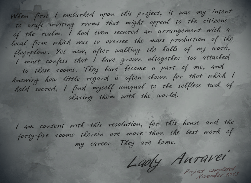 When first I embarked upon this project, it was my intent to craft inviting rooms that might appeal to the citizens of the realm. I had even secured an arrangement with a local firm which was to oversee the mass production of the floorplans. Yet now, after walking the halls of my work, I must confess that I have grown altogether too attached to these rooms. They have become a part of me, and knowing how little regard is often shown for that which I hold sacred, I find myself unequal to the selfless task of sharing them with the world.