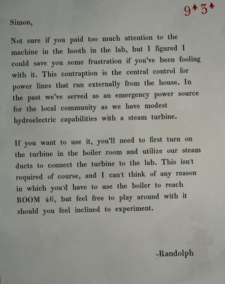 If you want to use it, you’ll need to first turn on the turbine in the boiler room and utilize our steam ducts to connect the turbine to the lab. This isn’t required of course, and I can’t think of any reason in which you’d have to use the boiler to reach ROOM 46, but feel free to play around with it should you feel inclined to experiment.