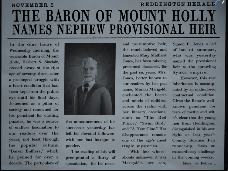 Nas primeiras horas da manhã de quarta-feira, o venerável Barão de Mount Holly, Herbert S. Sinclair, faleceu aos setenta e três anos, após uma longa luta contra uma condição cardíaca que havia sido mantida em segredo do público até seus últimos dias. Estimado como um pilar da sociedade e renomado por sua inclinação à criação de enigmas, ele foi uma fonte constante de fascínio para nossos leitores ao longo dos anos, especialmente por meio de sua popular coluna “Desafios do Barão,” que escreveu por mais de uma década.