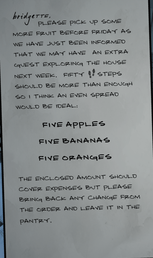 PLEASE PICK UP SOME MORE FRUIT BEFORE FRIDAY AS WE HAVE JUST BEEN INFORMED THAT WE MAY HAVE AN EXTRA GUEST EXPLORING THE HOUSE NEXT WEEK. FIFTY STEPS SHOULD BE MORE THAN ENOUGH SO I THINK AN EVEN SPREAD WOULD BE IDEAL: