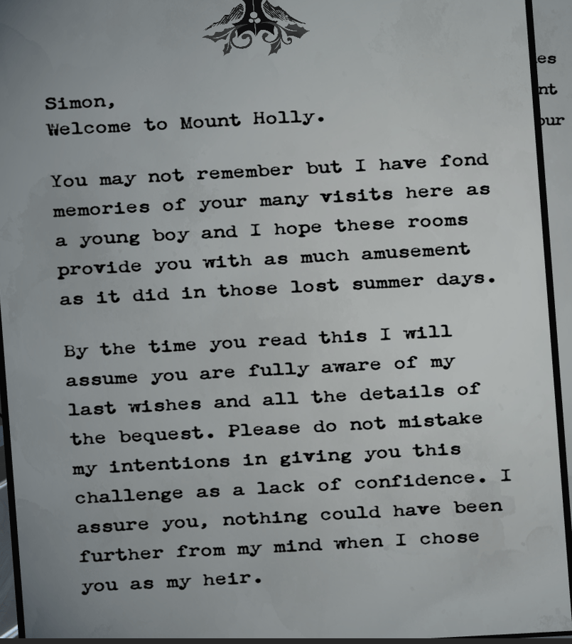 By the time you read this I will assume you are fully aware of my last wishes and all the details of the bequest. Please do not mistake my intentions in giving you this challenge as a lack of confidence. I assure you, nothing could have been further from my mind when I chose you as my heir.