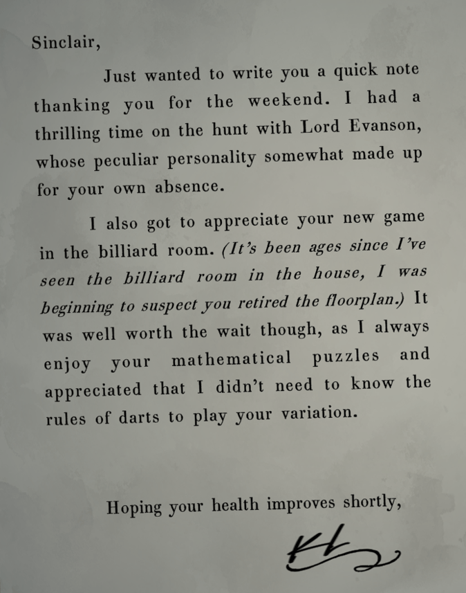 I also got to appreciate your new game in the billiard room. (It’s been ages since I’ve seen the billiard room in the house, I was beginning to suspect you retired the floorplan.) It was well worth the wait though, as I always enjoy your mathematical puzzles and appreciated that I didn’t need to know the rules of darts to play your variation.