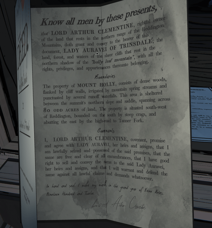 that LORD ARTHUR CLEMENTINE, rightful owner of the land that rests in the northern range of the Reddington Mountains, doth grant and convey to the bearer of this document, LADY AURAVEI OF TRINSDALE, the land, forest, and waters of the sheer cliffs that rest in the northern shadow of the “holly leaf mountain”, with all the rights, privileges, and appurtenances thereunto belonging.