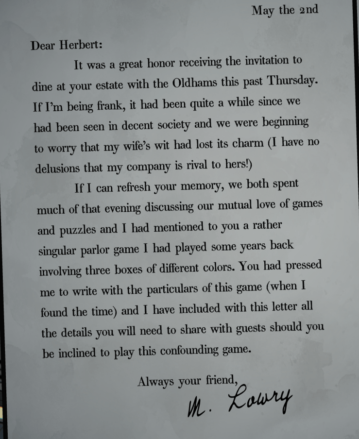 If I can refresh your memory, we both spent much of that evening discussing our mutual love of games and puzzles and I had mentioned to you a rather singular parlor game I had played some years back involving three boxes of different colors. You had pressed me to write with the particulars of this game (when I found the time) and I have included with this letter all the details you will need to share with guests should you be inclined to play this confounding game.
