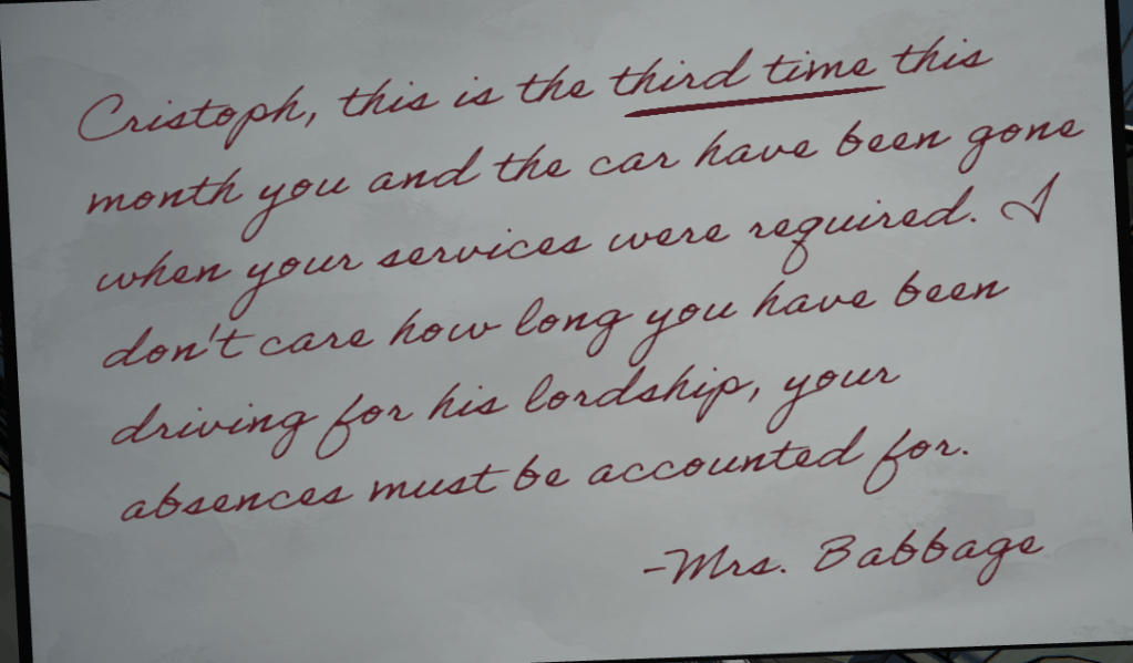 Cristoph, this is the third time this month you and the car have been gone when your services were required. I don’t care how long you have been driving for his lordship, your absences must be accounted for.