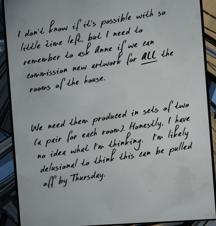 I don’t know if it’s possible with so little time left, but I need to remember to ask Anne if we can commission new artwork for ALL the rooms of the house.
