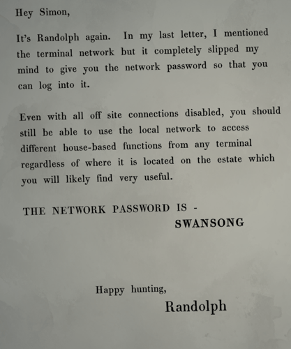 It’s Randolph again. In my last letter, I mentioned the terminal network but it completely slipped my mind to give you the network password so that you can log into it.