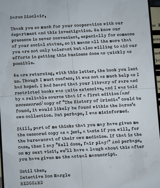 We are returning, with this letter, the book you lent us. Though I must confess, it was not as much help as I had hoped. I had heard that your library of rare and restricted books was quite extensive, and I was told by a reliable source that if a first edition (and uncensored) copy of “The History of Orindia” could be found, it would likely be found within the Baron’s own collection. But perhaps, I was misinformed.