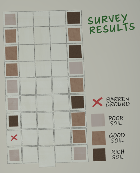 Para quantificar a qualidade do solo, medi sua capacidade de sustentar o crescimento de culturas e maximizar a promessa de altos rendimentos. A pesquisa acabou levando duas semanas devido à dificuldade de acesso aos níveis superiores, mas o projeto valeu o esforço. Como suspeitava, a posição dos cômodos tem uma relação direta com a quantidade de frutas que crescem nos jardins e com o número de flores que podem florescer em uma estufa.