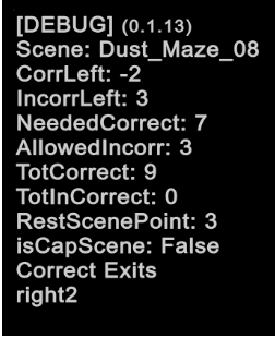 CorrLeft (Acertos restantes) : é o número de saídas corretas que o jogador ainda precisa pegar para completar o labirinto. Pegar saídas corretas reduz esse valor em 1 (com algumas exceções, detalhadas abaixo).
